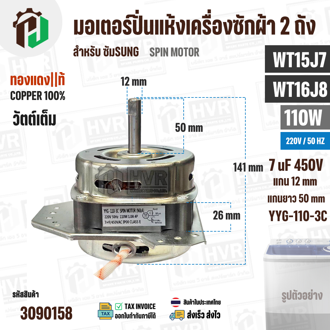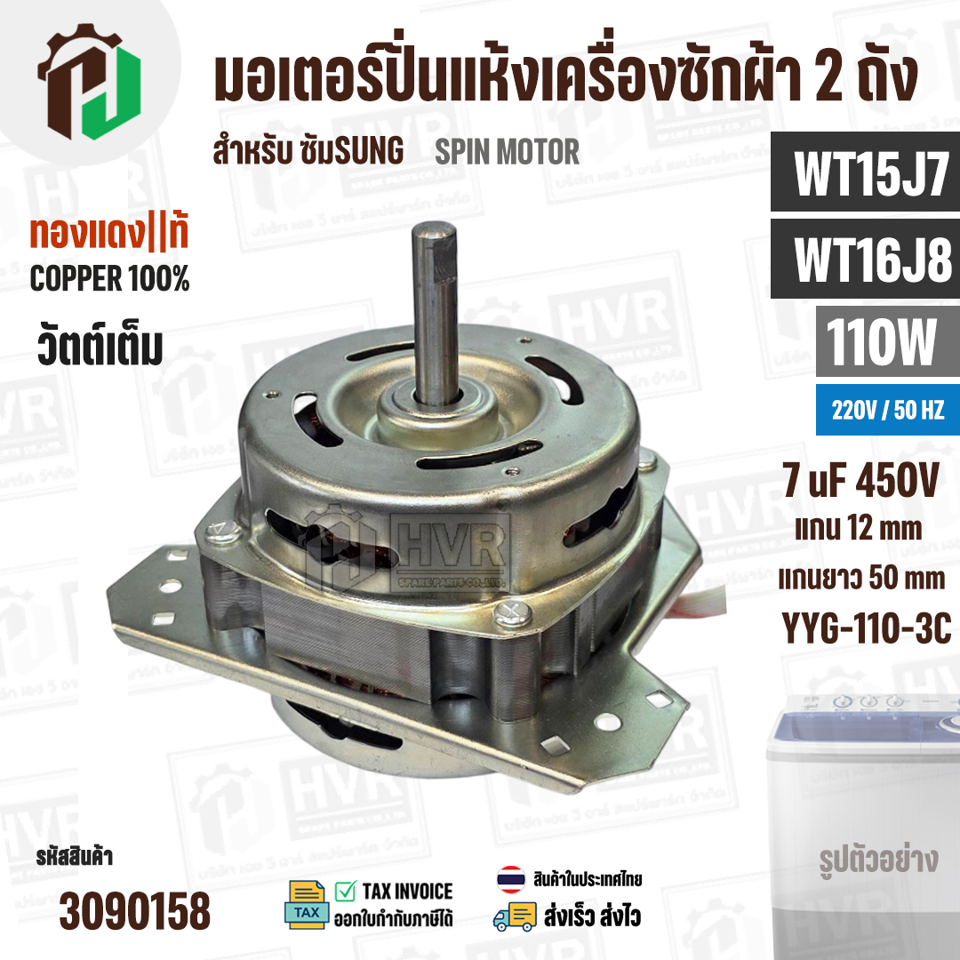 มอเตอร์ปั่นแห้ง SAMSUNG WT15J7 , WT16J8 ( 13-14 kg.) 110W 220V 7 uF ( YYG-110-3C ) ( ทรงคางหมู ) ( ทองแดงแท้ ) #อะไหล่เครื่องซักผ้า #3090158