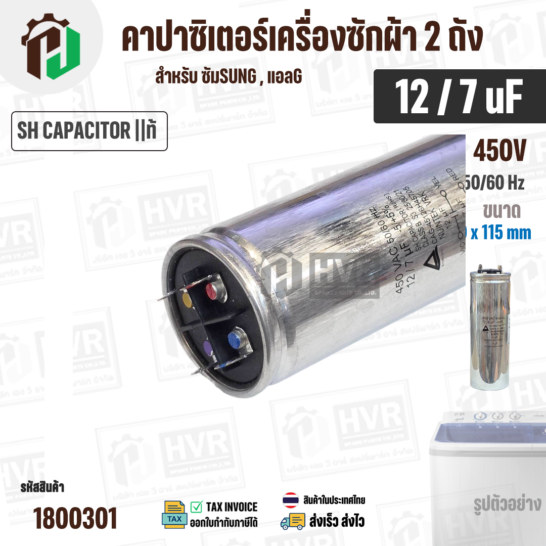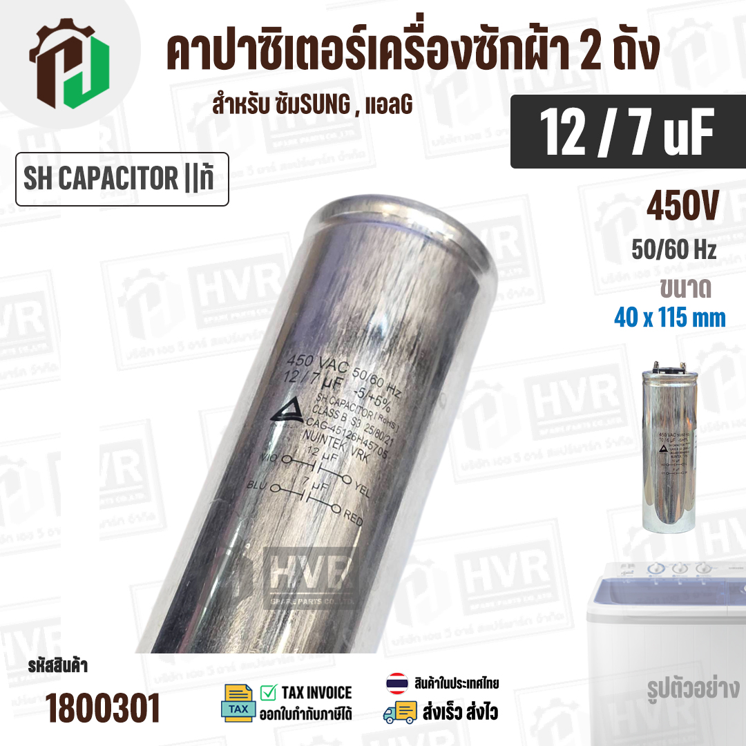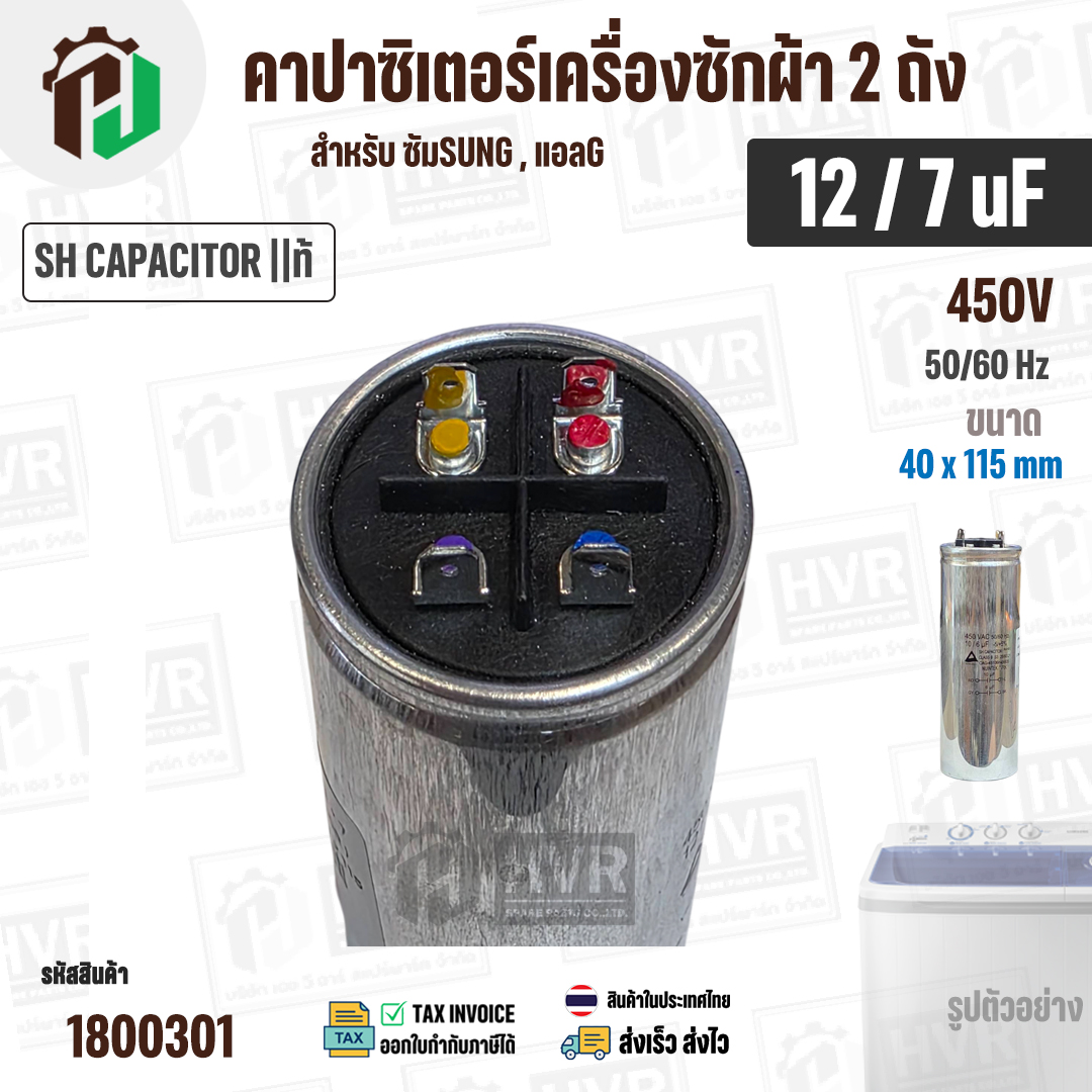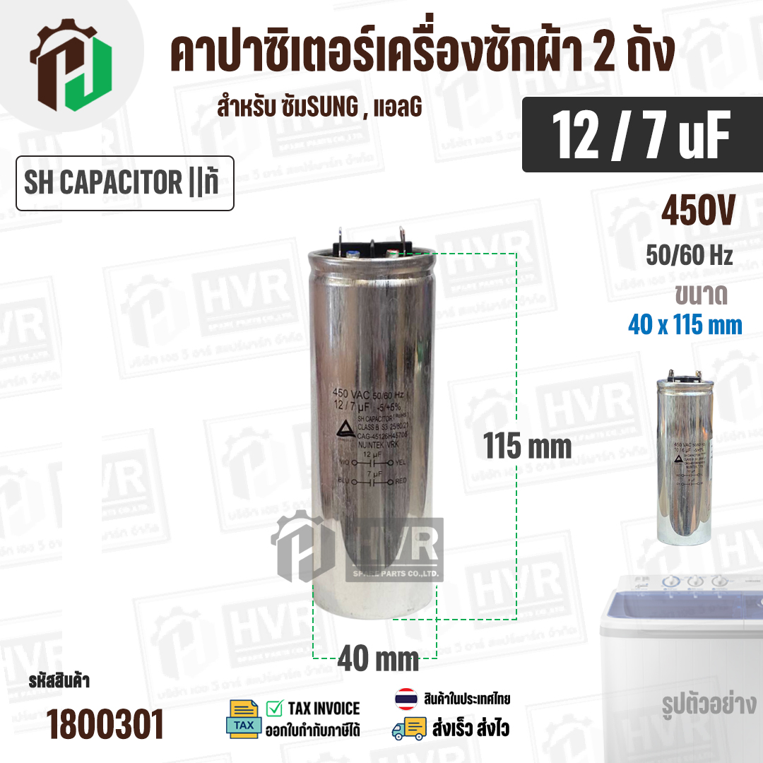 คาปาซิเตอร์เครื่องซักผ้า 12 / 7 uF 450V ( SH CAPACITOR )( อลูมิเนียม กลม เสียบ) ( 40 x 115 mm ) ( แท้ ) #1800301