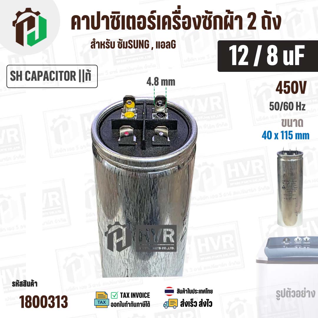 คาปาซิเตอร์เครื่องซักผ้า 12 / 8 uF 450V ( SH CAPACITOR )( อลูมิเนียม กลม เสียบ) ( 40 x 115 mm ) ( แท้ ) #1800313