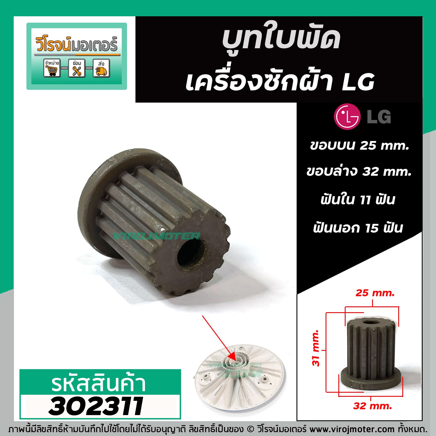 > อะไหล่เครื่องซักผ้า > บูทใบพัด > บูทใบพัดเครื่องซักผ้า LG รู 11 ฟัน เฟืองนอก 15 ฟัน ขอบบน 25 mm. ขอบล่าง 32 mm. สูง 31 mm. #302311 ---------------------------------- >> รายละเอียดสินค้า << ---------------------------------------