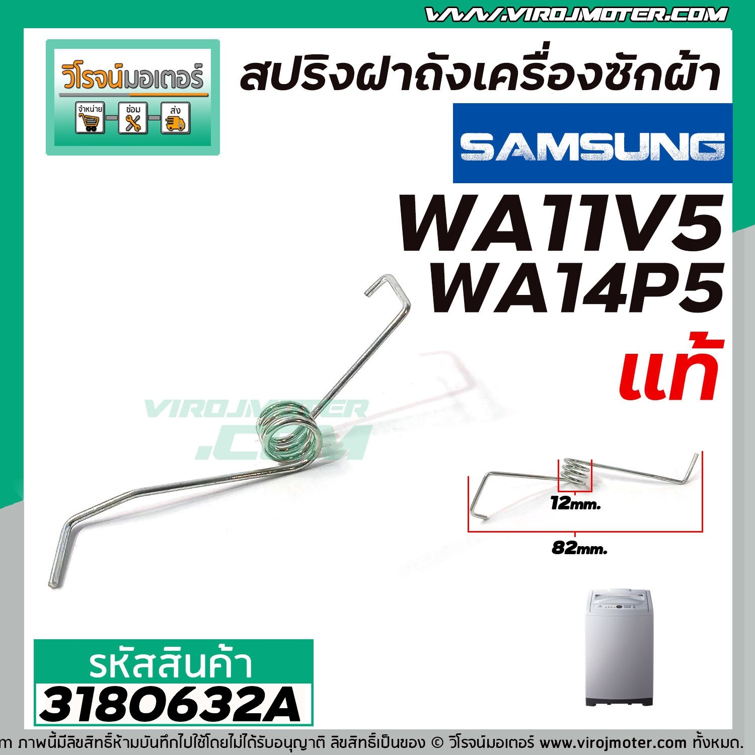 >> ** อะไหล่แท้ ( Original Part ) ** <<>> ใช้สำหรับเป็นอะไหล่ซ่อมสปริงฝาถังเครื่องซักผ้า แบบถังเดี่ยวอัตโนมัติ>> สำหรับ รุ่น SAMSUNG>> สำหรับรุ่น WA11V5 , WA14P5>> ขนาดสปริง ขาว 82 mm.>> Part No.DC61-00342E>> ******************* ข้อแนะนำ ********************** <<ร้านเราเป็นศูนย์ซ่อมเครื่องมือช่างโดยเฉพาะ ด้วยประสบการณ์มากกว่า 30 ปี เราจึงรู้ว่าอะไหล่ชิ้นไหนเหมาะกับการมาใช้งานสินค้าที่ราคาถูกจนเกินไปอาจจะคุณภาพต่ำกว่ามาตราฐาน และมีส่วนทำให้เครื่องมีปัญหาบานปลายลูกค้าควรตรวจสอบก่อนซื้อ*************************************************#สปริงฝาถังเครื่องซักผ้าSAMSUNG #สปริงฝาเครื่องซักผ้าSAMSUNG #สปริงฝาปิดเครื่องซักผ้าถังเดี่ยวซัมซุง #สปริงฝาเครื่องซักผ้าsamsungWA11V5 #WA14P5 #สปริงฝาเครื่องซักผ้าSamsungWA14P5 #DC61-00342E