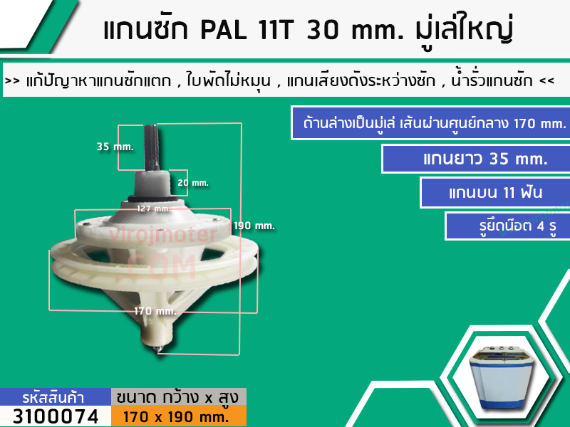 > อะไหล่เครื่องซักผ้า > แกนซักเครื่อง 2 ถัง > แกนซัก PAL 11T แกนยาว 30 mm. มู่เล่ใหญ่ >> ใช้สำหรับเป็นอะไหล่ซ่อมแกนซักเครื่องซักผ้า 2 ถัง