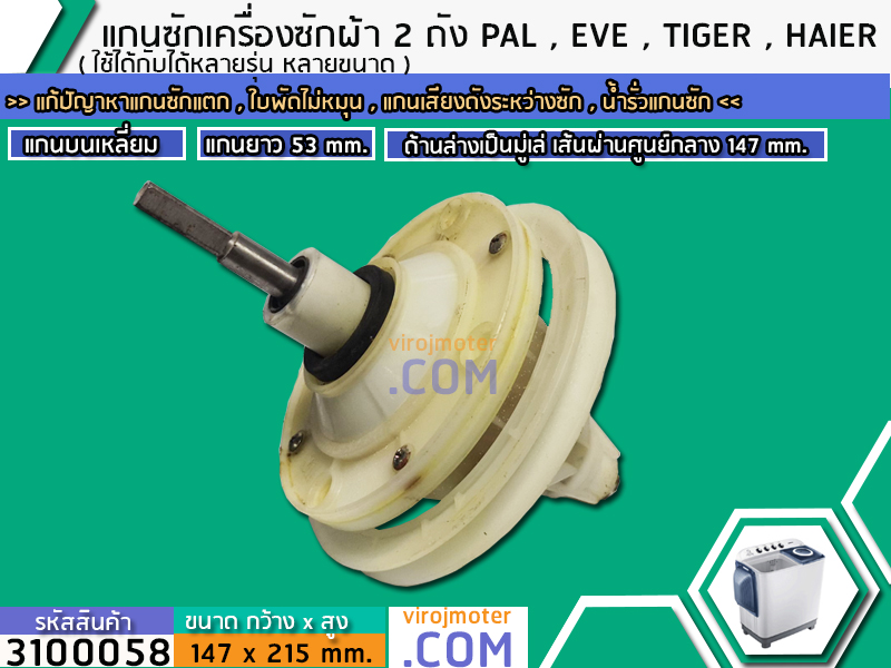 >> ใช้สำหรับเป็นอะไหล่ซ่อมแกนซักเครื่องซักผ้า 2 ถัง>> แก้ปัญหา แก้ปัญาหาแกนซักแตก , ใบพัดไม่หมุน , แกนเสียงดังระหว่างซัก , น้ำรั่วแกนซัก>> ชื่อเรียก แกนซักเครื่องซักผ้า 2 ถัง , กระปุกเฟืองซักเครื่องซักผ้า 2 ถัง , เฟืองทดเครื่องซักผ้า 2 ถัง , เกียรเครื่องซักผ้า 2 ถัง , ชุดเกียรเครื่องซักผ้า 2 ถัง>> สำหรับ ยี่ห้อ PAL , TIGER , EVE , HAIER , เครื่องจีนทั่วไป>> สำหรับ รุ่น ใช้ได้กับได้หลายรุ่น หลายขนาด-------- รายละเอียดสินค้า>> รูยึดน๊อต 4 รู>> แกนด้านบนเหลี่ยม ยาว 53 mm.>> รูน๊อตยึดใบพัดใช้สกรู M6>> ด้านล่างเป็นมู่เล่ DIA :147 mm.>> ขนาดเฉพาะแกนซัก กว้าง 147 mm. x สูง 215 mm.>> รหัสสินค้า 3100058#แกนซักเครื่องซักผ้าPAL #กระปุกเฟืองซักเครื่องซักผ้าPAL , #เฟืองทดเครื่องซักผ้าPAL #เกียรเครื่องซักผ้าPAL #ชุดเกียรเครื่องซักผ้าPAL#แกนซักเครื่องซักผ้าจีน #กระปุกเฟืองซักเครื่องซักผ้าจีน , #เฟืองทดเครื่องซักผ้าจีน #เกียรเครื่องซักผ้าจีน #ชุดเกียรเครื่องซักผ้าจีน#แกนซักเครื่องซักผ้าKIA #กระปุกเฟืองซักเครื่องซักผ้าKIA , #เฟืองทดเครื่องซักผ้าจีน #เกียรเครื่องซักผ้าKIA #ชุดเกียรเครื่องซักผ้าKIA