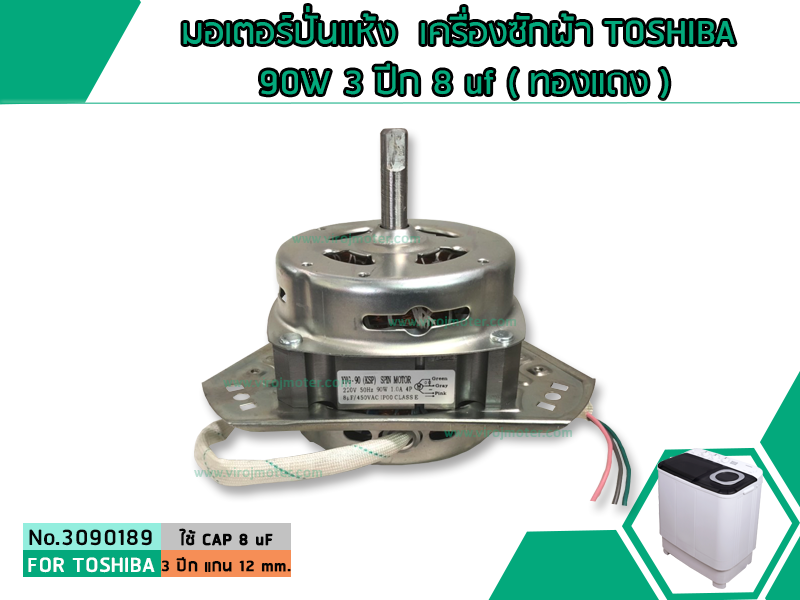 > อะไหล่เครื่องซักผ้า > มอเตอร์เครื่องซักผ้า > มอเตอร์ปั่นแห้ง เครื่องซักผ้า TOSHIBA 90W 3 ปีก 8 uf ( ทองแดง ) > ใช้สำหรับเป็นอะไหล่มอเตอร์เครื่องซักผ้าถังปั่นแห้ง
