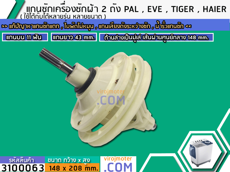 แกนซักเครื่องซักผ้า 2 ถัง PAL , TIGER , EVE , KIA , HAIER , เครื่องจีนทั่วไป แกนบน 11 ฟัน คอยาว 43 mm. ล่างเป็นมู่เล่ 148 mm. >> ( เกรด A ) <<>> ใช้สำหรับเป็นอะไหล่ซ่อมแกนซักเครื่องซักผ้า 2 ถัง>> แก้ปัญหา แก้ปัญาหาแกนซักแตก , ใบพัดไม่หมุน , แกนเสียงดังระหว่างซัก , น้ำรั่วแกนซัก>> ชื่อเรียก แกนซักเครื่องซักผ้า 2 ถัง , กระปุกเฟืองซักเครื่องซักผ้า 2 ถัง , เฟืองทดเครื่องซักผ้า 2 ถัง , เกียรเครื่องซักผ้า 2 ถัง , ชุดเกียรเครื่องซักผ้า 2 ถัง>> สำหรับ ยี่ห้อ PAL , TIGER , KIA , EVE , HAIER , เครื่องจีนทั่วไป>> สำหรับ รุ่น ใช้ได้กับได้หลายรุ่น หลายขนาด-------- รายละเอียดสินค้า>> รูยึดน๊อต 4 รู>> แกนด้านบน 11 ฟัน ยาว 43 mm.>> รูน๊อตยึดใบพัดใช้สกรู M6>> ด้านล่างเป็นมู่เล่ DIA :148 mm.>> ขนาดเฉพาะแกนซัก กว้าง 128 mm. x สูง 208 mm.>> รหัสสินค้า 3100063#แกนซักเครื่องซักผ้าPAL #กระปุกเฟืองซักเครื่องซักผ้าPAL , #เฟืองทดเครื่องซักผ้าPAL #เกียรเครื่องซักผ้าPAL #ชุดเกียรเครื่องซักผ้าPAL#แกนซักเครื่องซักผ้าจีน #กระปุกเฟืองซักเครื่องซักผ้าจีน , #เฟืองทดเครื่องซักผ้าจีน #เกียรเครื่องซักผ้าจีน #ชุดเกียรเครื่องซักผ้าจีน#แกนซักเครื่องซักผ้าKIA #กระปุกเฟืองซักเครื่องซักผ้าKIA , #เฟืองทดเครื่องซักผ้าจีน #เกียรเครื่องซักผ้าKIA #ชุดเกียรเครื่องซักผ้าKIA