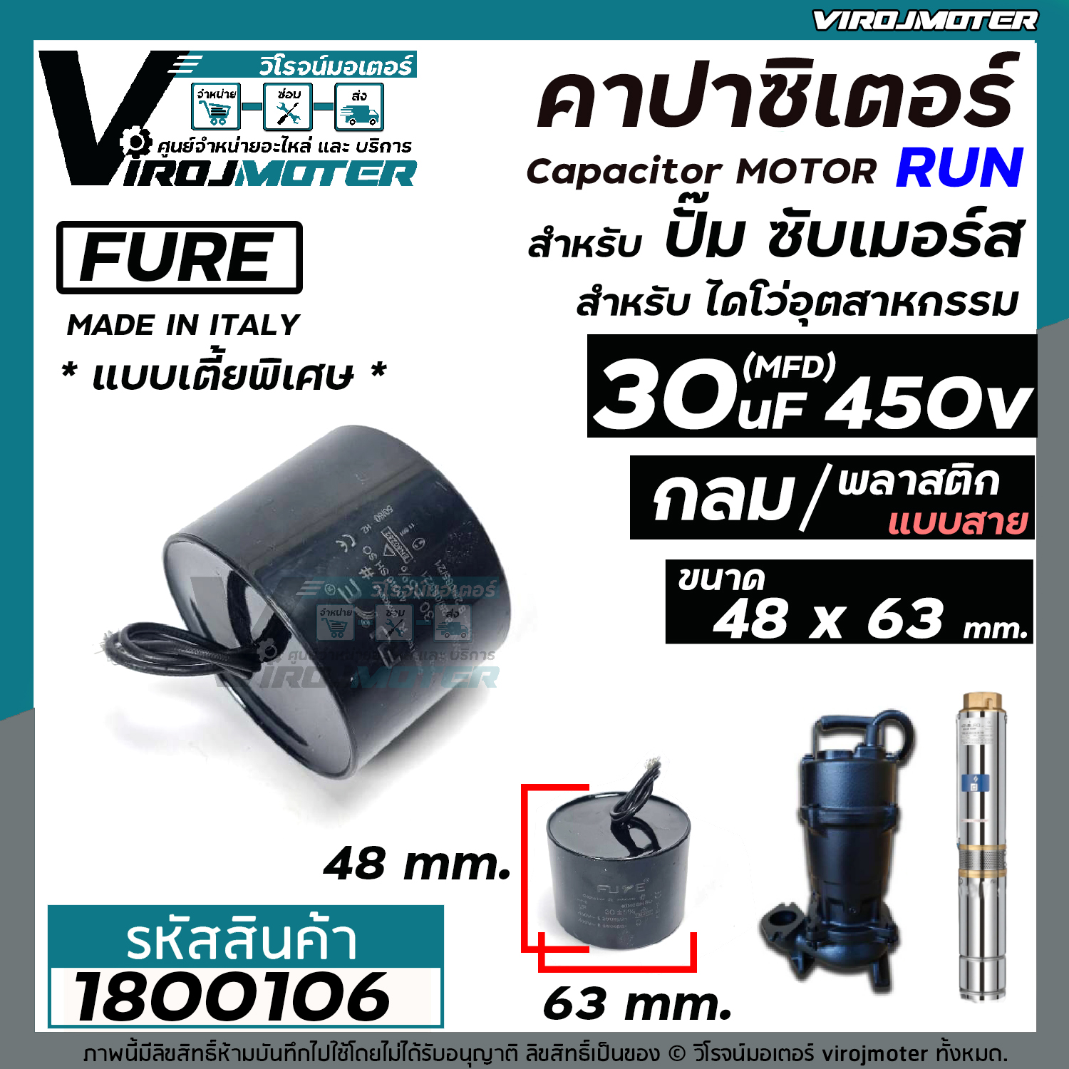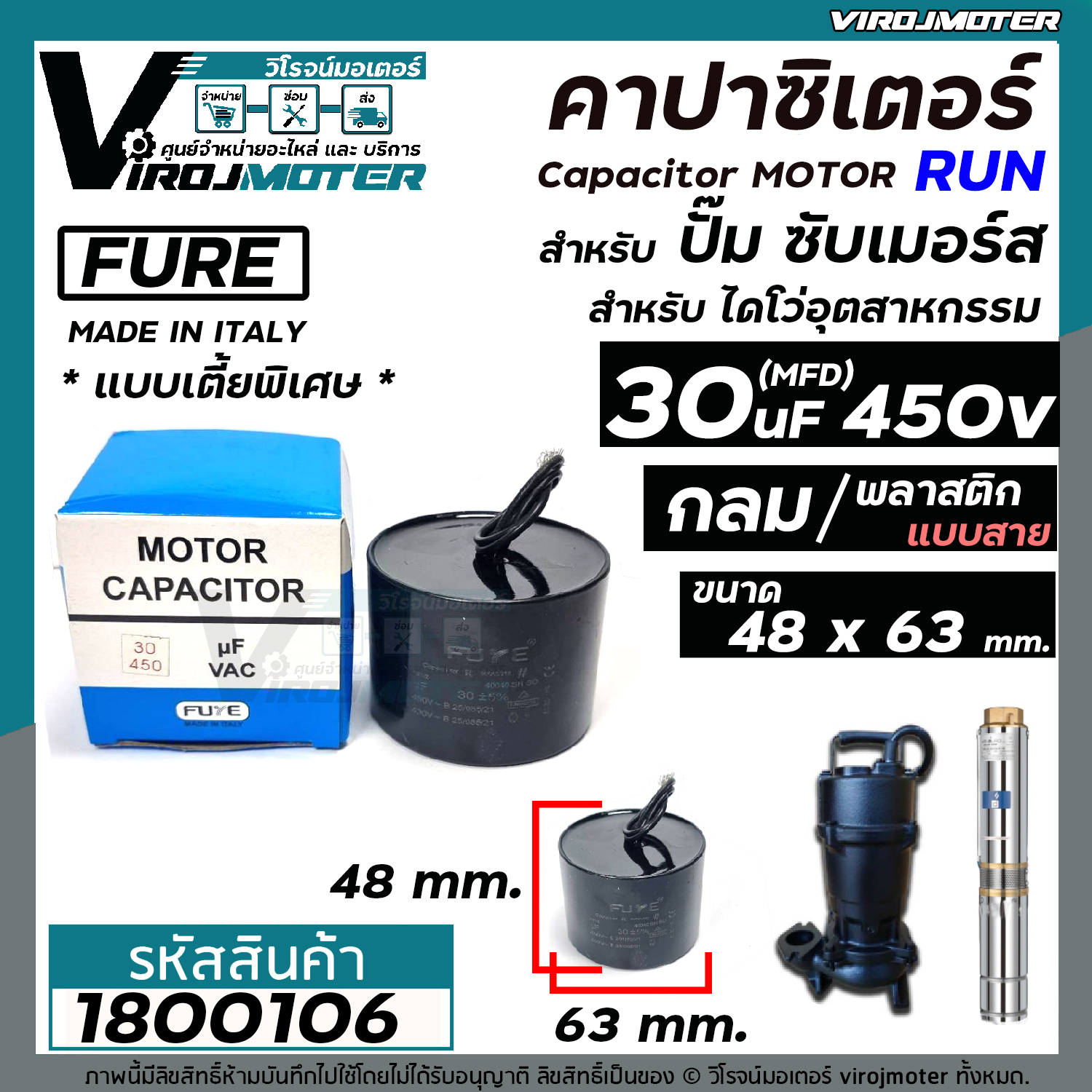> อะไหล่มอเตอร์ > คาปาซิเตอร์ (RUN ) > Capacitor 30 uF ( MFD ) 450V แบบไซส์กลมเตี้ยพิเศษ สำหรับใส่ปั้มซับเมิร์ส #FURE ( ขนาดตัว 48 x 63 mm.) >> รหัสสินค้า 1800106