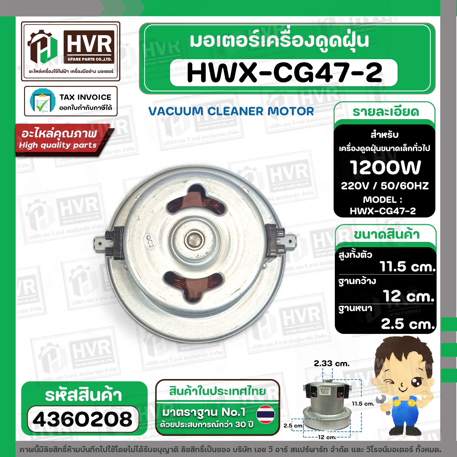มอเตอร์เครื่องดูดฝุ่น สูง 115 mm. x ฐาน 120 mm. ฐานหนา 25 mm. #HWX-CG47-2 1200W 220V #4360208