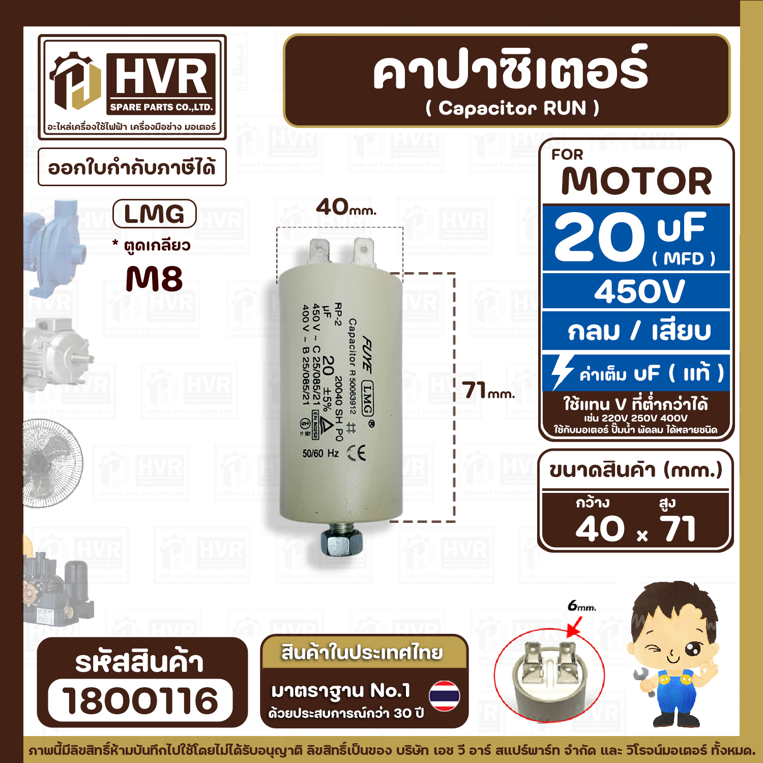 > อะไหล่ปั้มลม > คาปาซิเตอร์ ( Cap ) ปั้มลม > คาปาซิเตอร์ ( Cap Run ) 20 uF 450V ( ตูดเกลียว M8 กลม แบบเสียบ ) ( LMG ) ( 40 x 71 mm. )