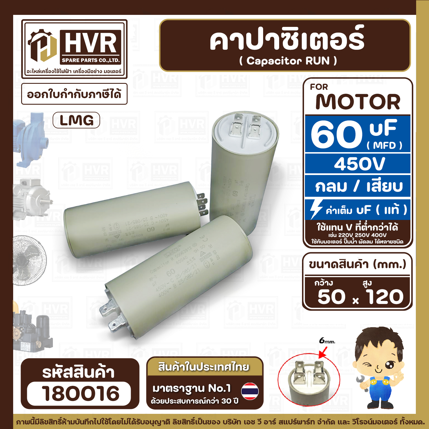 > อะไหล่มอเตอร์ > คาปาซิเตอร์ (RUN ) > คาปาซิเตอร์ ( Cap Run ) 60 uF 450V ( กลม แบบเสียบ ) ( LMG ) ( 50 x 120 mm. )