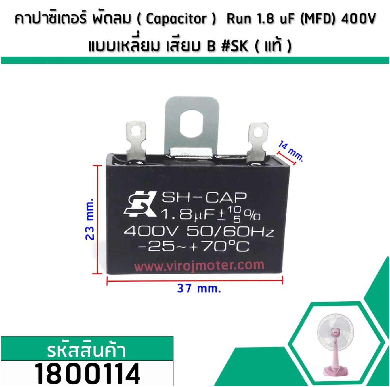 >> ยี่ห้อ SK (เอสเค) ** แท้ ***>> MODEL : SH-CAP>> ค่า 1.8 uF 400V 50/60Hz>> ขนาด (Size) ขนาด 14 mm. x 37 mm. x 23 mm.>> สำหรับพัดลม Hatari For Model: HF-T18M2, HT-T18M3, HE-S18M1, HT-S18M2, Slide Smart L1, HA-P18M1, Hf-P18R1, HF-W18M3, HT-W18M4, HF-W18R1