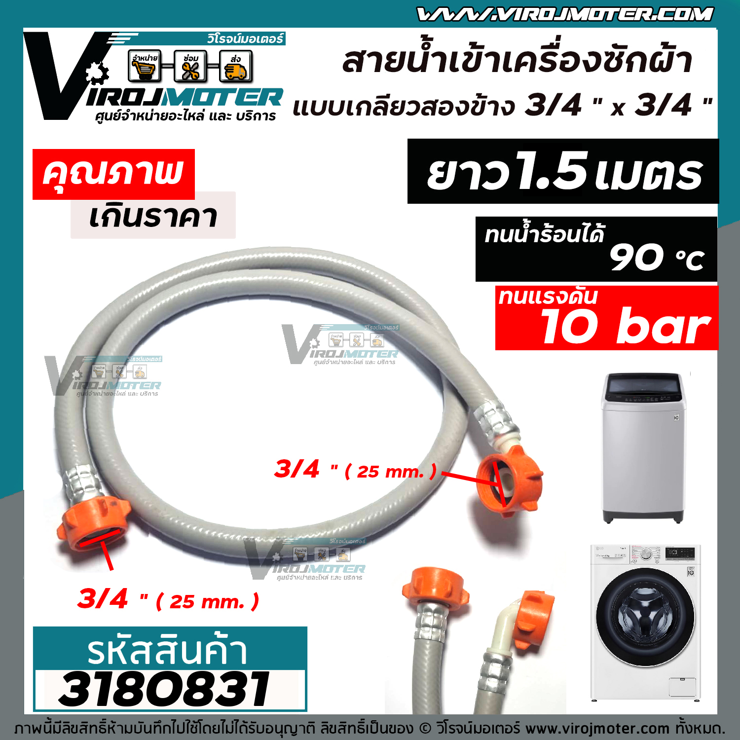 > อะไหล่เครื่องซักผ้า > สายน้ำเข้า > สายน้ำเข้าเครื่องซักผ้า ฝาหน้า และ แบบฝาบน เกลียว 3/4" x 3/4" ยาว 1.1 เมตร 90 องศา แรงดัน 10 bar #3180831 --------- รายละเอียดสินค้า ---------