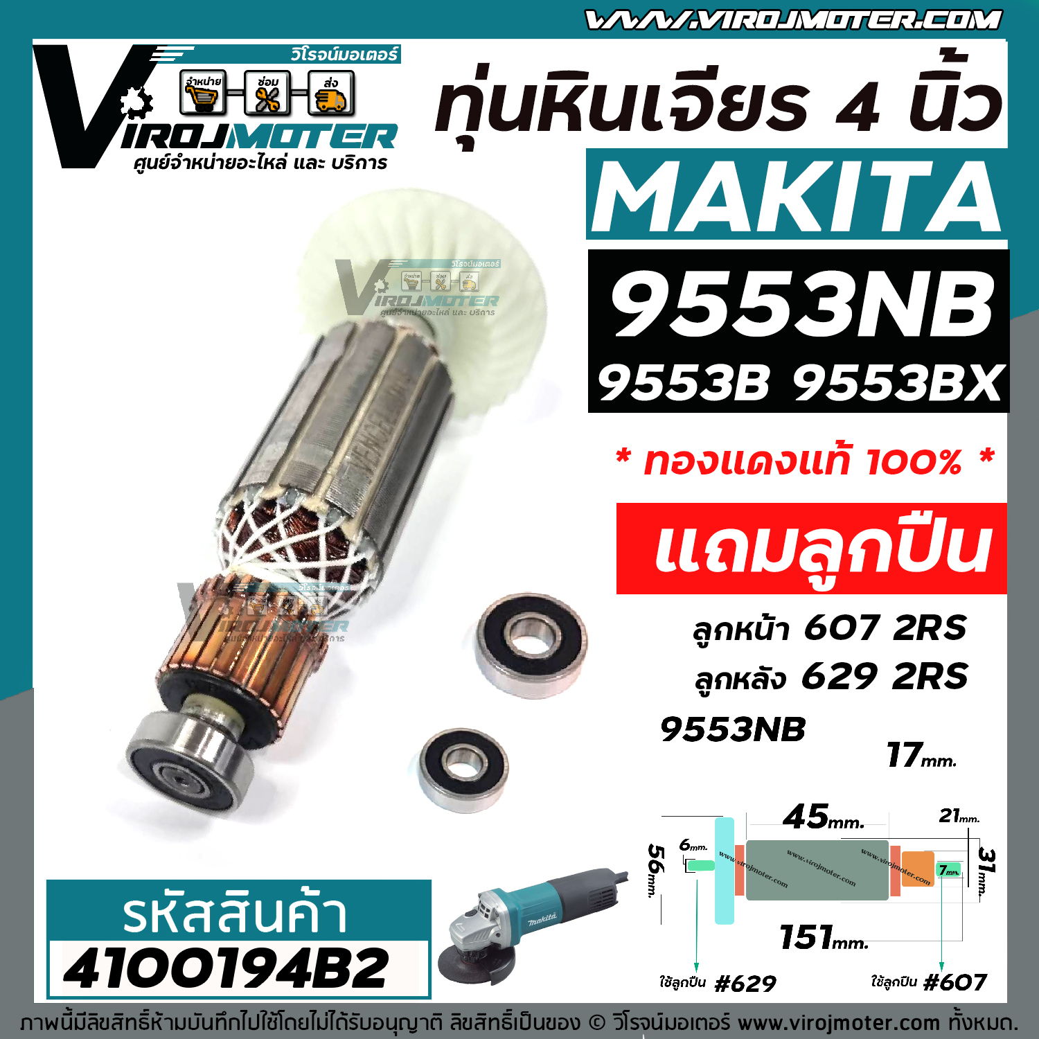 >> Premium Grade A (พรีเมี่ยมเกรดเอ) <<>> ทุ่นหินเจียร์ สำหรับ MAKITA รุ่น 9553B , 9553NB , 9553BX , 9553HB , 9553HN , 9554B , 9554NB , 9554BX , 9554HB , 9554HN ( ใช้ทุ่นตัวเดียวกัน )>> ใช้แปรงถ่าน CB-325 ( ไม่แถม )>> ใช้ ลูกปืนด้านใบพัด เบอร์ 607 ( ** แถม ** )>>ใช้ ลูกปืนด้านหัวคอมมิว เบอร์ 629 ( ** แถม ** )>> ผลิตจากทองแดงอย่างดี>> ขดลวดเคลือบด้วยน้ำยาอย่างดี ป้องกันฝุ่นละออง และการลัดวงจรที่อาจจะเกิดขึ้น>> เคลือบฉนวนกันลวดขยายตัว และช่วยระบายอากาศได้ดีหมายเหตุ : สามารถใช้ได้กับ หินเจียร์จีน MODEL : 9553 บางรุ่นได้