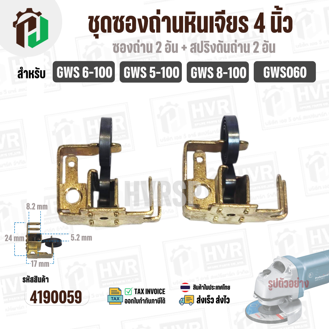 ชุดซองถ่าน + สปริงดัน หินเจียร BOSCH GWS 5-100 , GWS 6-100 , 8-100, GWS060 , GGS5000L #4190059 >> ใช้สำหรับเป็นอะไหล่ซ่อมซองถ่านหินเจียร BOSCH ( บ๊อช ) รุ่น GWS 5-100 , GWS 6-100 , 8-100, GWS060 , GGS5000L >> ในชุดมี 1. ซองถ่าน 2 อัน 2. สปริงดันถ่าน 2 อัน