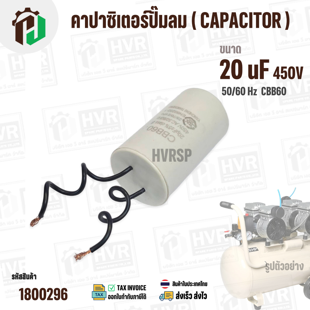 >> ใช้สำหรับเป็นอะไหล่ปั๊มลม มอเตอร์ไฟฟ้า ปั้มน้ำ มอเตอร์พัดลมแอร์>> แก้ปัญหาปั๊มน้ำไม่ทำงาน(Solved the water pump problem)- แก้ปัญหาพัดลมไม่หมุนและ ช่วยเพิ่มแรงหมุนพัดลม(Solved the fan did not work and increase speed)>> ทำหน้าที่ ตัวเก็บประจุพลังงานในรูปสนามไฟฟ้า>> ขนาด 20 uF หรือ 20 MFD (ไมโครฟารัด) คือ ค่าเดียวกัน>> กำลังไฟ 450 Vac ( หมายเหตุ : ใช้แทนค่าที่โวลต์ (V) ต่ำกว่าได้ เช่น 200V / 220V / 300V / 400V เป็นต้น โวลยิ่งมากหมายถึงสามารถต้านทานกระแสไฟได้มาก ยิ่งมากยิ่งดี>> วิธีดูค่าคาปาซิเตอร์ ให้เทียบดูค่า uF(ไมโครฟารัด) จากบนตัวคาปาซิเตอร์ตัวเก่าได้เลยจะมีระบุไว้ข้างตัวคาปาซิเตอร์>> คาปาซิเตอร์แบบสายใช้แทน แบบขั้วเสียบได้เลย ไม่มีปัญหา แต่สายจะสะดวกกับการเชื่อมต่อ>> ราคา ต่อ 1 ตัว