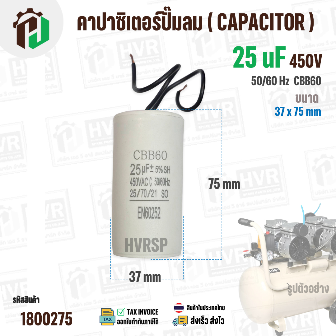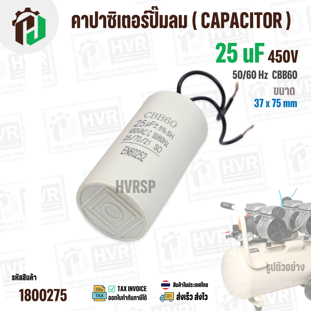 คาปาซิเตอร์ปั๊มลมออยฟรี 25 uF 450V ( กลม สาย ) ( CCB60 ) ( 38 x 75 mm ) #1800275